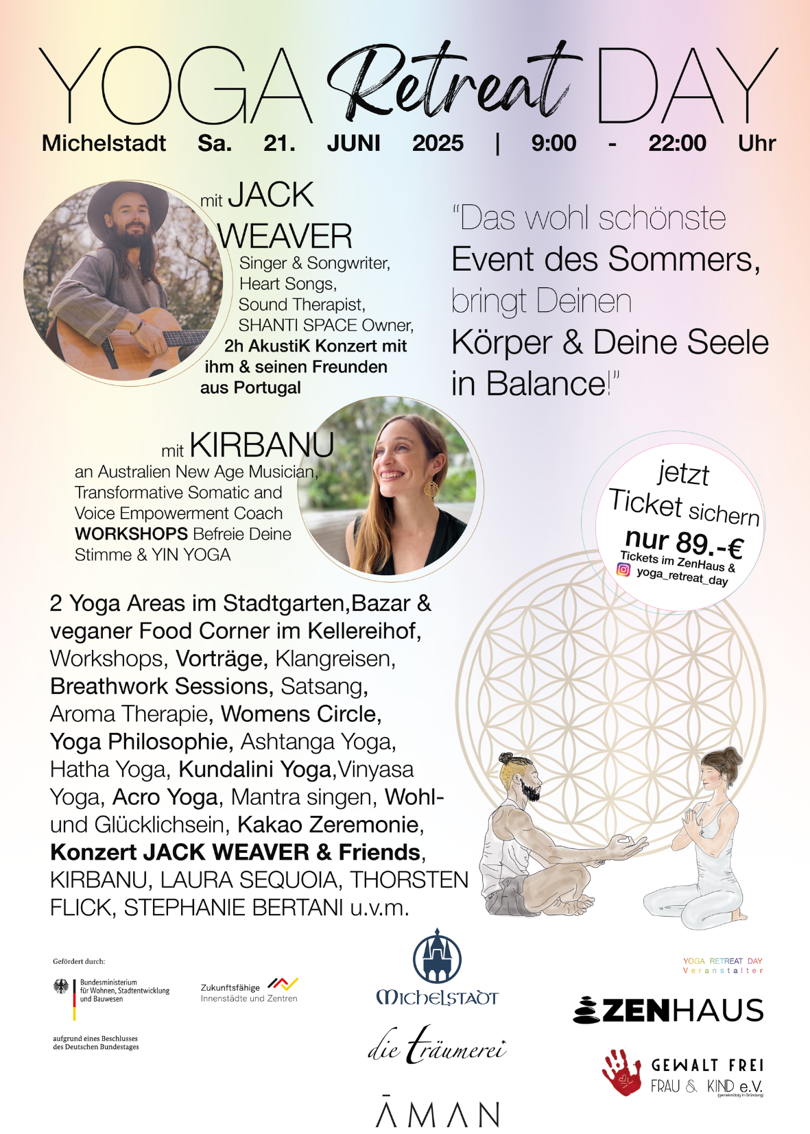 2 Yoga Areas im Stadtgarten, Bazar & veganer Food Corner im Kellereihof, Kids Area, Workshops, Vorträge, Klangreisen, Breathwork Sessions, Satsang, Aroma Therapie, Womens Circle, Yoga Philosophie, Ashtanga Yoga, Hatha Yoga, Kundalini Yoga, Vinyasa Yoga, Acro Yoga, Mantra singen, Wohl- und Glücklichsein, Kakao Zeremonie, 2h Akustik Konzert am Abend mit Jack Weaver!